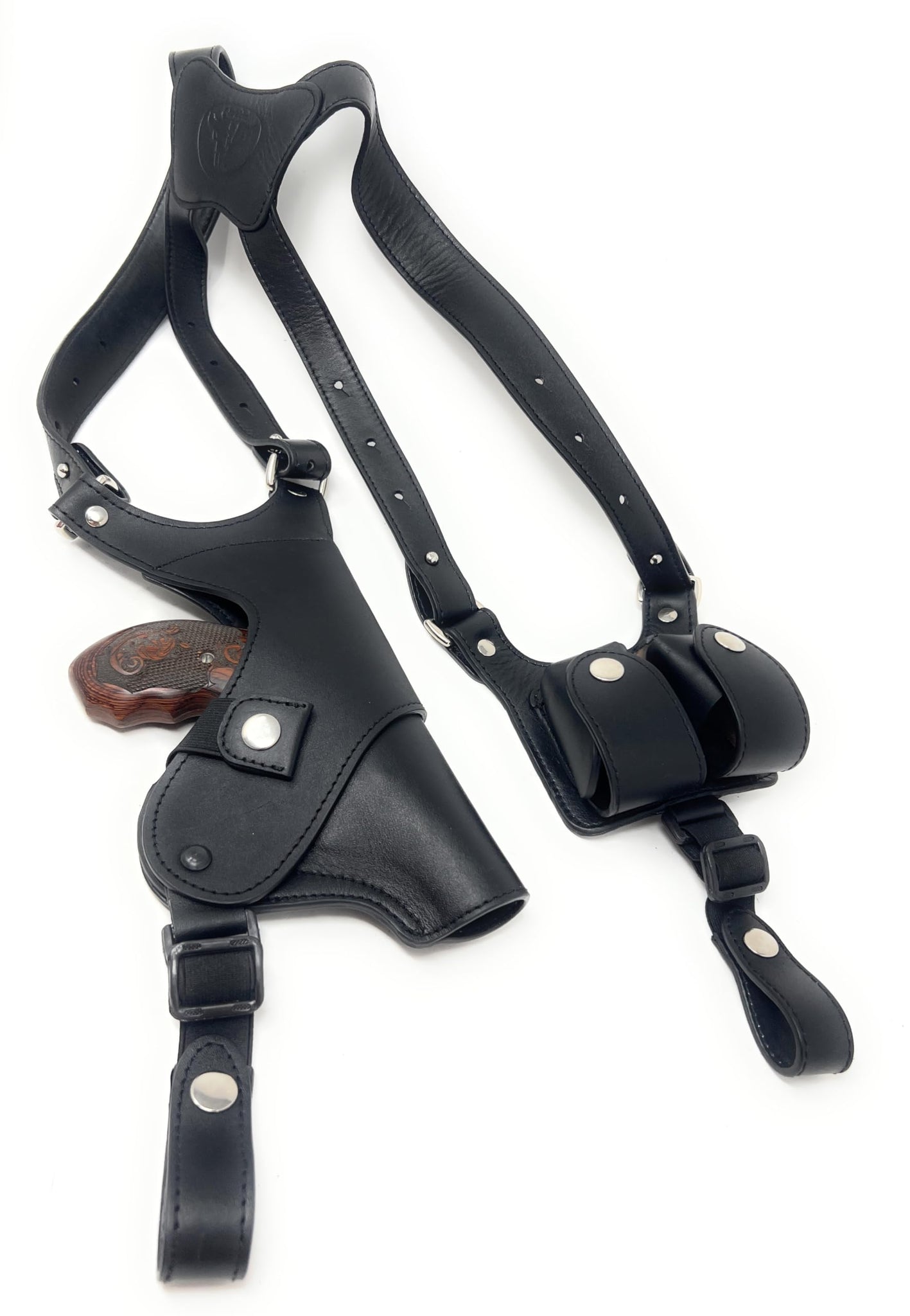 • [Key Features] Light, durable, and comfortable construction | Thumb break snap provides secure, Level 2 Retention | Integrated dual speed-loader magazine pouch with durable metal fasteners | Holster can rotate to be either parallel or perpendicular to your body | Adjustable leather shoulder holster straps fit most body types | Equipped with elastic belt loop connectors for comfortable belt anchoring | Tanned with natural, biodegradable vegetable dyes to protect your health and your firearm!