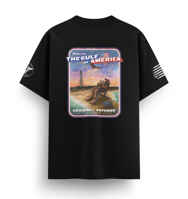 Cardini Defense “Gulf Coast Bigfoot” Graphic Tee – Men’s Patriotic Beach Postcard Shirt, 60/40 Cotton-Poly Blend