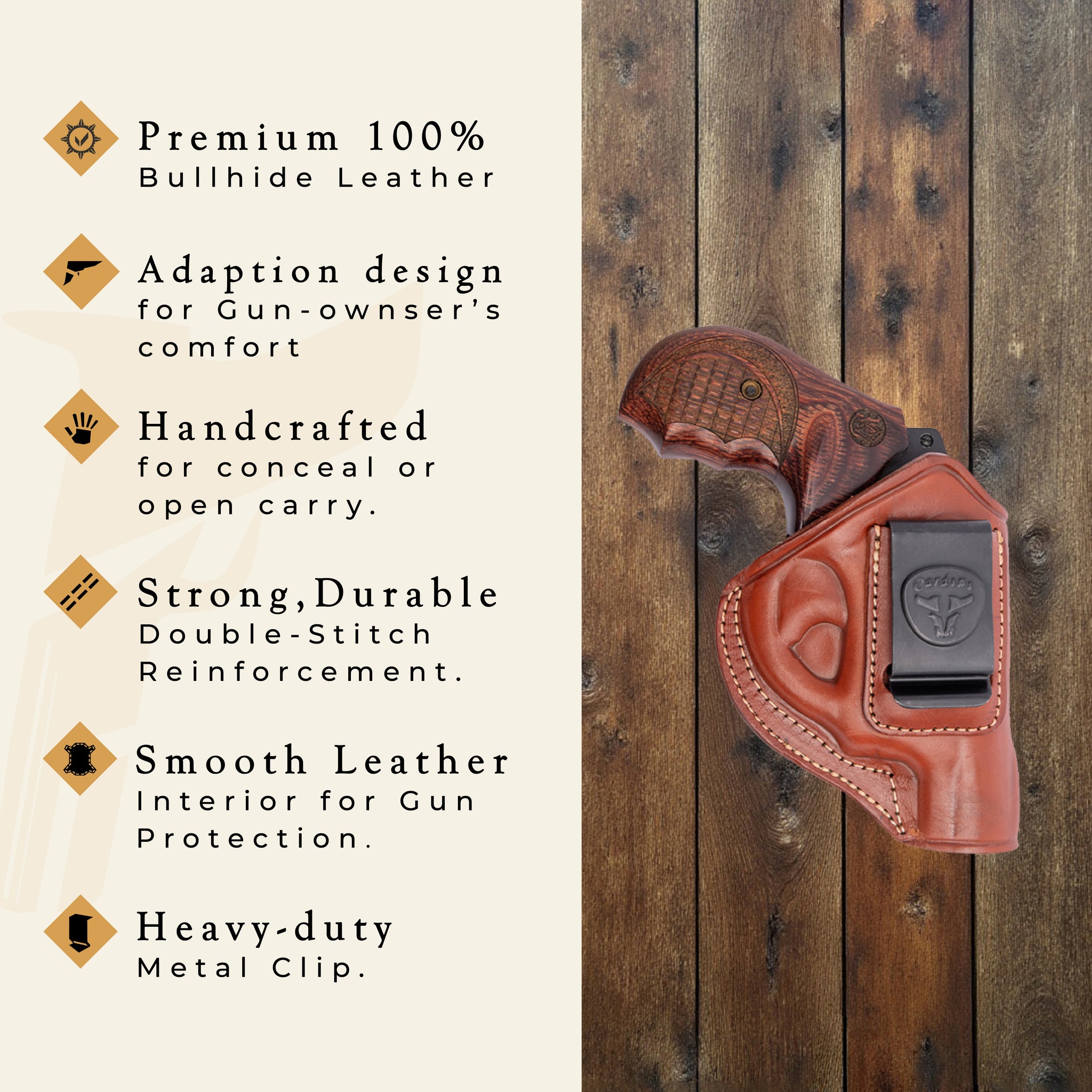 • DIMENSIONES Y AJUSTE: El cuero se relajará con el uso y sujetará el arma de fuego de forma segura; Un protector contra el sudor elevado en la parte posterior que aísla el arma de fuego del cuerpo; La construcción única de dos piezas está contorneada para moldear la curva de su cuerpo para un ajuste más natural y máxima comodidad durante todo el día; Perfil más estrecho que otras fundas ocultas.