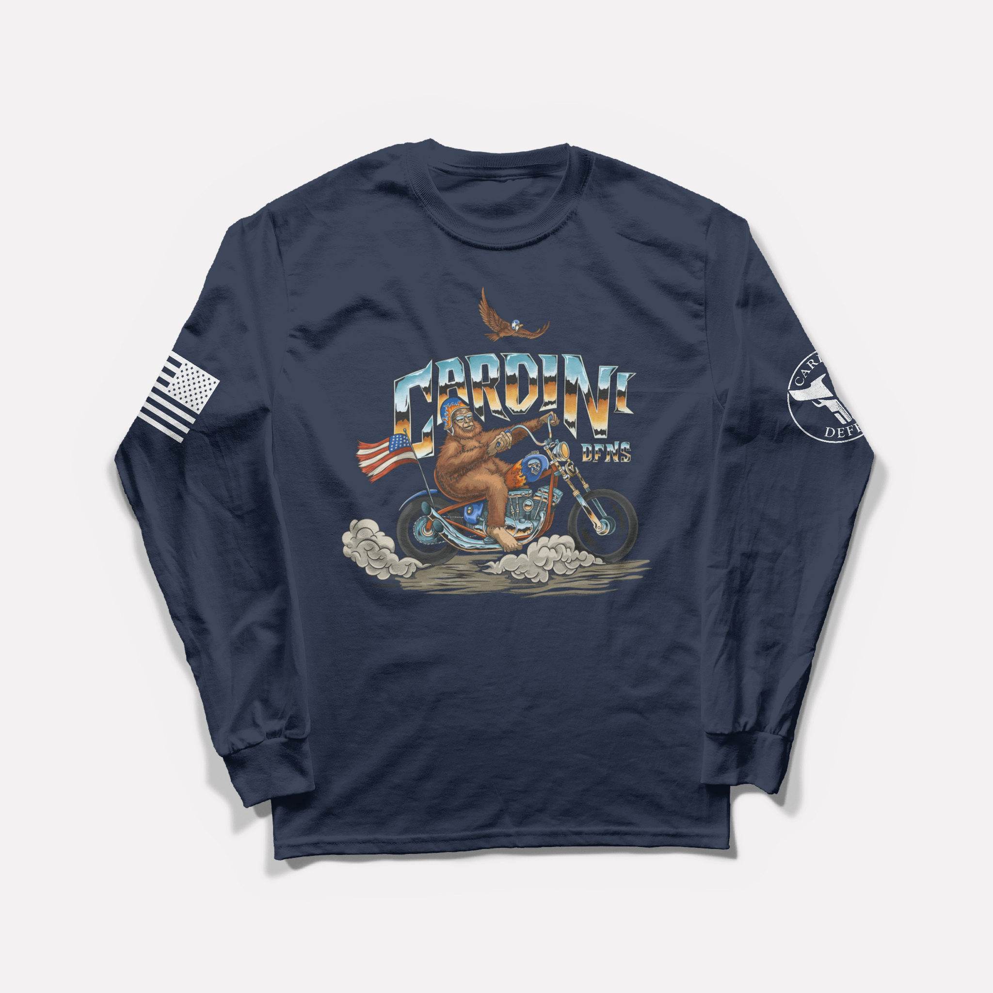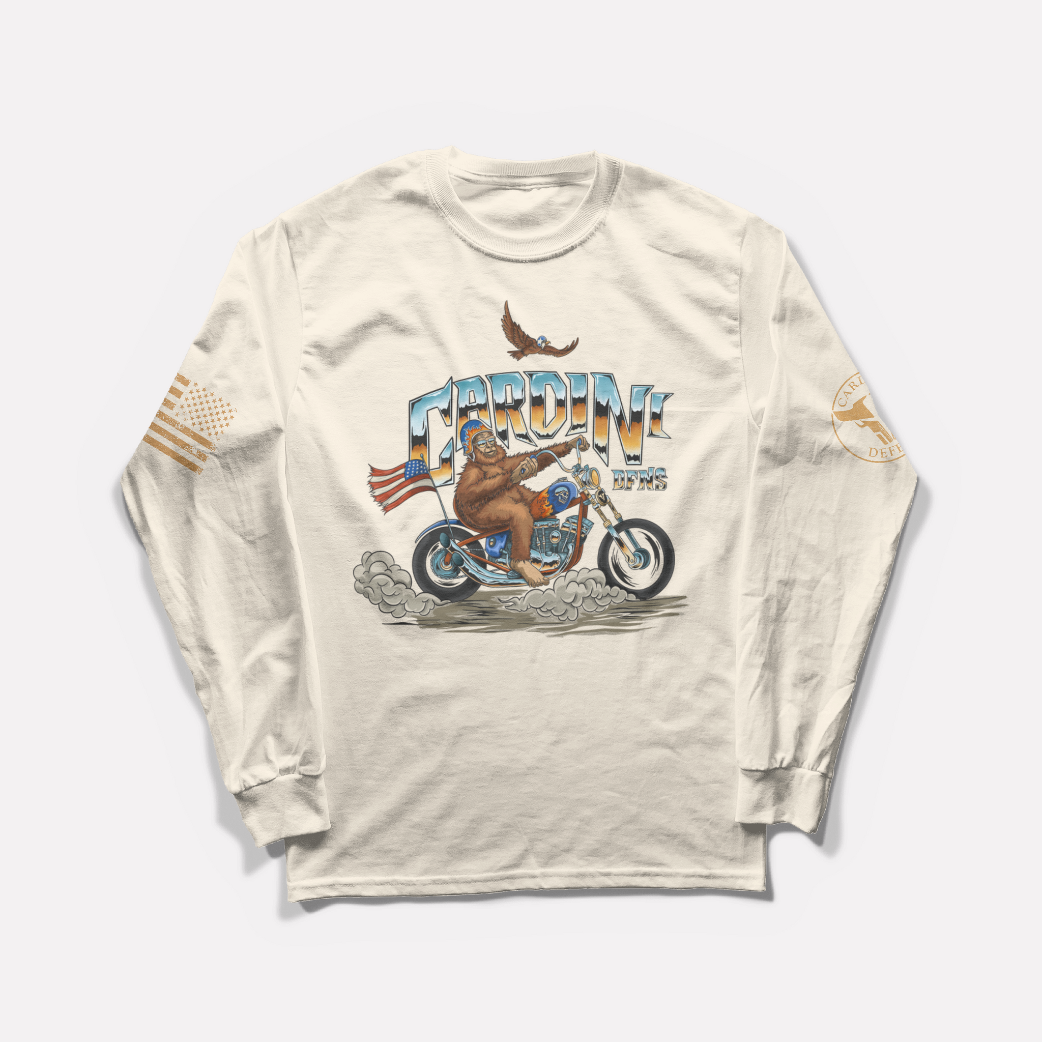 Ride in legendary style with the Cardini Defense “Bigfoot Rider” Graphic Tee. Crafted from a soft, breathable 60/40 cotton-poly blend, this sand-colored shirt combines comfort with rugged durability. The front showcases an eye-catching graphic of Bigfoot tearing up the highway on a chopper motorcycle, American flag waving behind him, and an eagle soaring overhead—a tribute to freedom, adventure, and American pride. Details like the vintage-inspired Cardini Defense logo on the left sleeve and the patriotic flag print on the right sleeve add extra flair. Whether you’re hitting the road or kicking back with friends, this tee is the ultimate choice for those who live life wide open.
